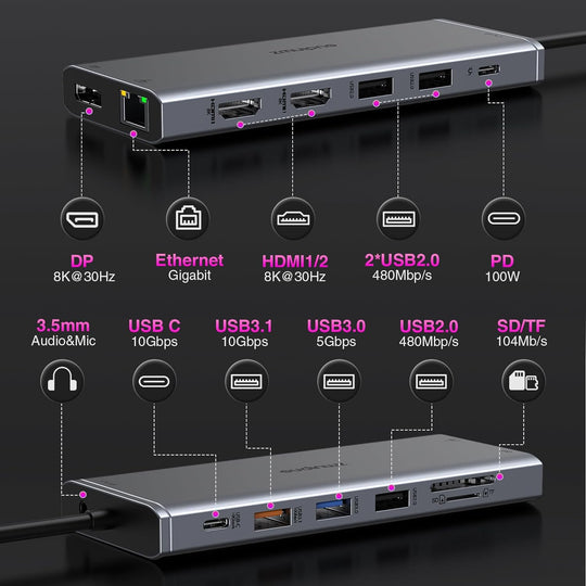 【USB C Docking Station 14-in-1】: Plug and play. With this USB C Hub Multiple Adapter, you get 2*8K HDMI, 8K DisplayPort (When connected separately), USB C Port(10Gbps), USB 3.1(10Gbps), USB C Port (10Gbps), USB 3.0,2*USB 2.0...Sale price $79.99Regular price $89.99