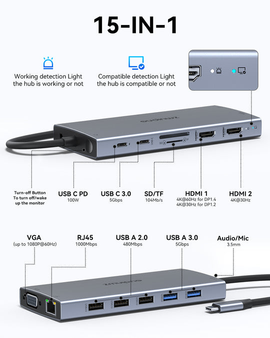 USB C Docking Station for Laptop 15 IN 1: Elevate your workspace with the docking station, designed for convenience and productivity. Perfect as a laptop docking station, it supports laptop docking station dual monitor setups with...Sale price $79.99Regular price $99.99 -