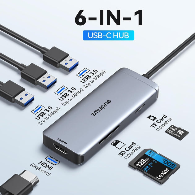 USB C Hub Multiport Adapter, 6 in 1 USB Type C Dongle Mac Accessories Converter with 4K HDMI, 3 USB 3.0, SD/TF Card Reader for MacBook Pro Air 2021 2020 2019 M1, Surface Go, Dell XPS 13 15 and More
