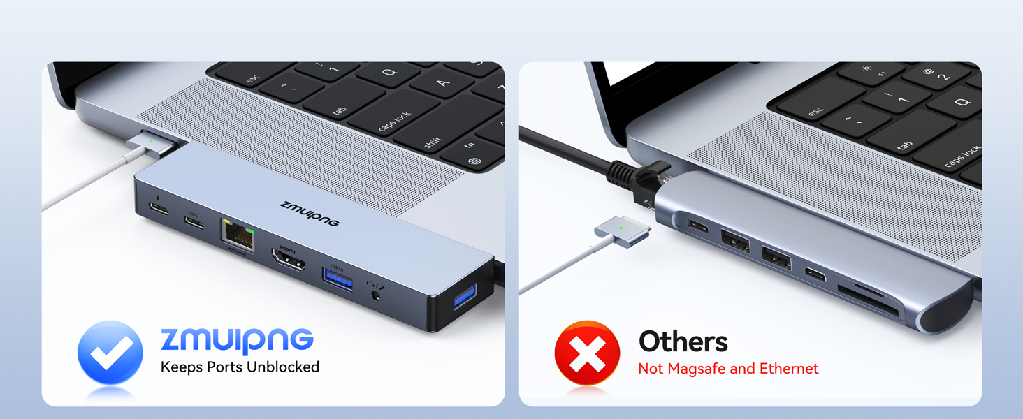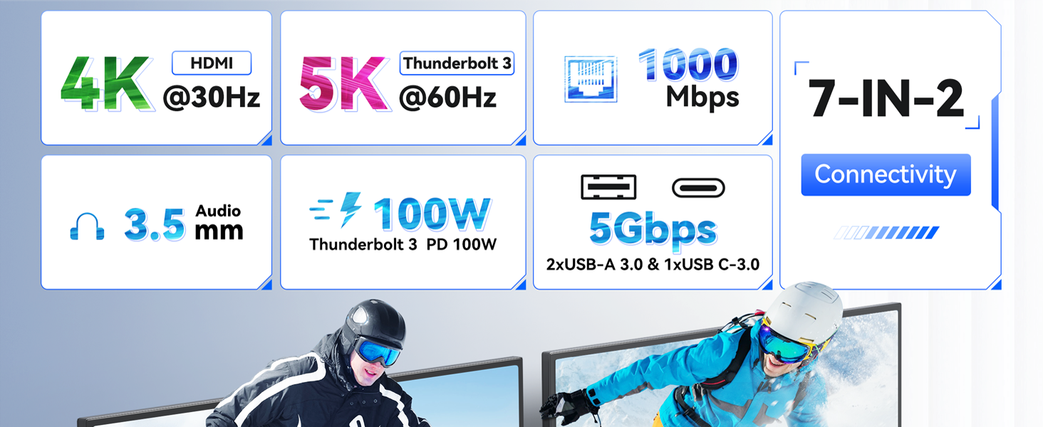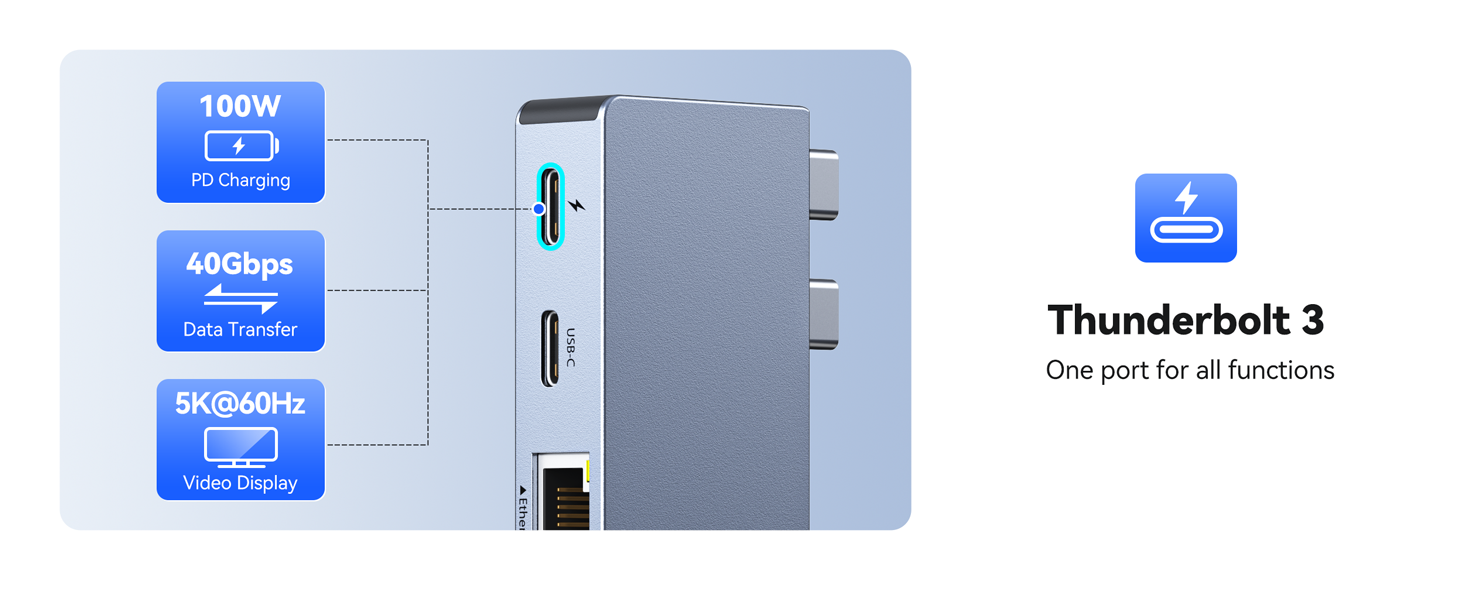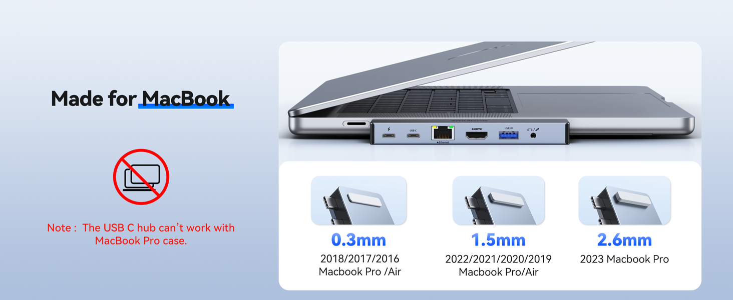 - 【MacBook Pro Adapter 7 IN 2】 Built with aluminum alloy case, specially accessory designed for MacBook Pro 2023/2022/2021/2020/2019/2018, MacBook Air 2023/2022/2020/2019/2018; Easily fulfill your daily use by extending two USB C port to 4K@30Hz HDMI, Thunderbolt 3 port(5K@60Hz 100W PD 40Gbps Data Transfer), USB C 3.0 Data port, Gigabit Ethernet, 2 * USB 3.0 ports,1 * 3.5mm Audio&Mic port. Notice: This USB C Adapter won’t Work with Laptop Cases