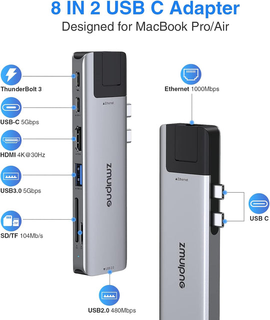 MacBook USB Adapter 8 IN 2: Built with aluminum alloy case, specially accessory designed for MacBook Pro 2020/2019/2018/2017/2016, MacBook Air 2018/2019/2020; Easily fulfill your daily use by extending two USB C port to 4K HDMI,Thunderbolt 3...Sale price $39.99Regular price $49.99