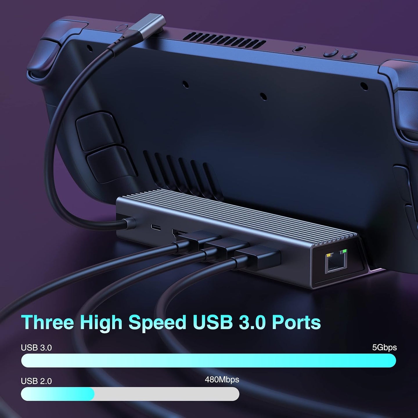 • Stable 1000Mbps Ethernet port: This steam deck dock supports 10/100/1000BASE-T Lan Networks,worryfree about wifi's instability and interference from USB 3.0. Enjoy stable and smoother gaming.