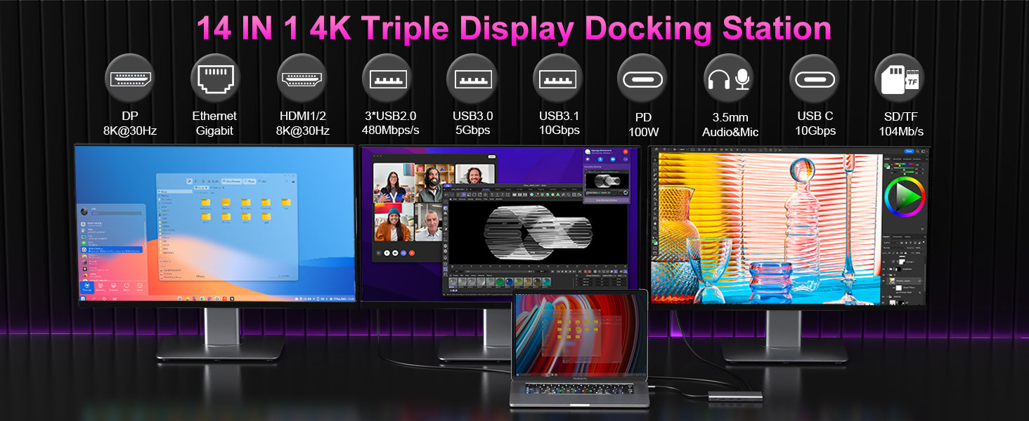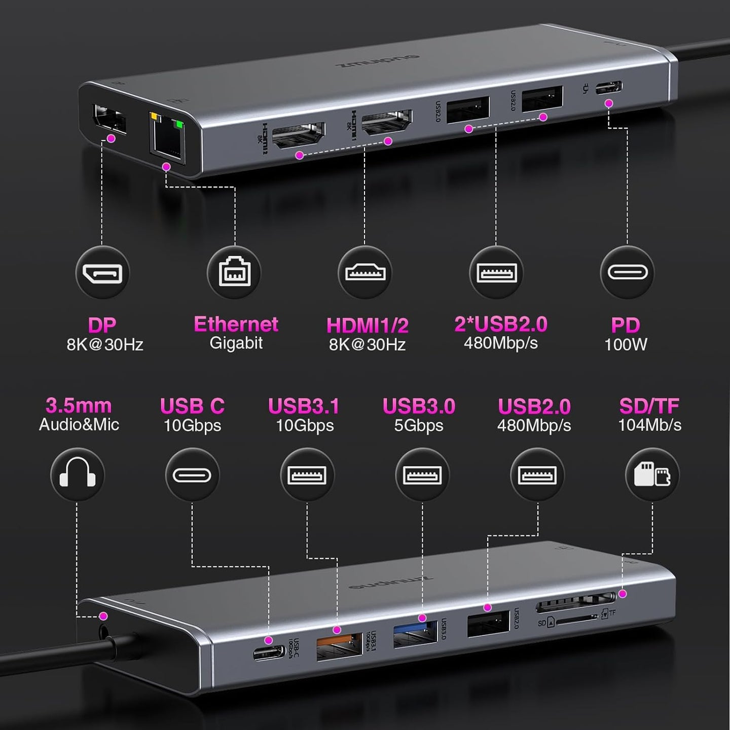 - 【USB C Docking Station 14-in-1】: Plug and play. With this USB C Hub Multiple Adapter, you get 2*8K HDMI, 8K DisplayPort (When connected separately), USB C Port(10Gbps), USB 3.1(10Gbps), USB C Port (10Gbps), USB 3.0,2*USB 2.0 , Gigabit Ethernet port,100W PD,3.5mm Audio, SD/TF Port.