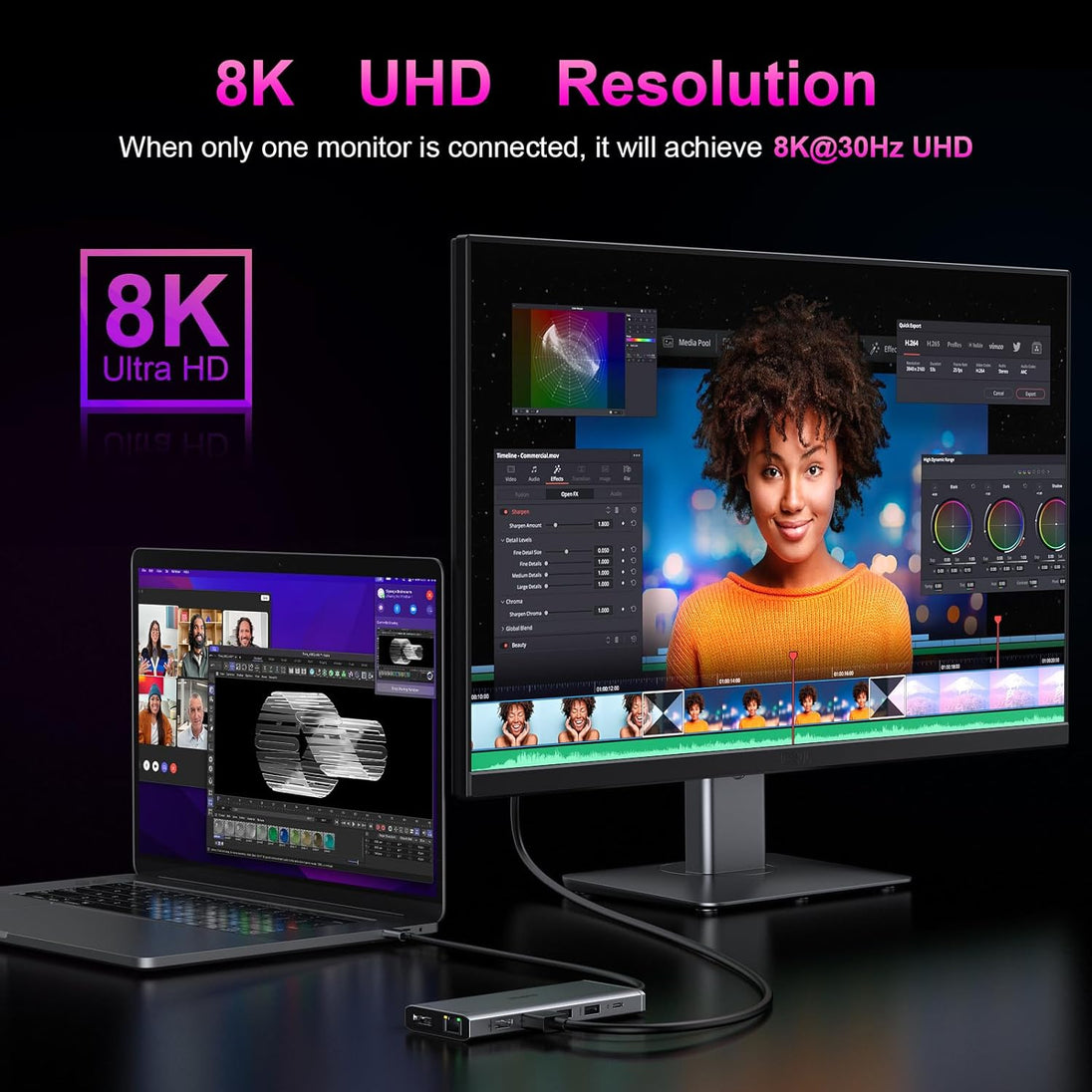 USB C Docking Station Dual Monitor for Dell/HP Laptop, Triple 4K Display Single 8K@30Hz/4K@120Hz USB C Hub Multiple Adapter 14-in-1 with 2HDMI+DP+USB3.1+5USB+RJ45+PD+SD/TF+Audio for Lenovo/iPhone 15